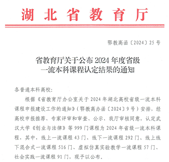 近日,湖北省教育厅发布《省教育厅关于公布2024年度省级一流本科课程认定结果的通知》(鄂教高函〔2024〕25号),388vip太阳集团12门课程成功入围,获评课程门数位居全省独立院校第一,民办院校第三。