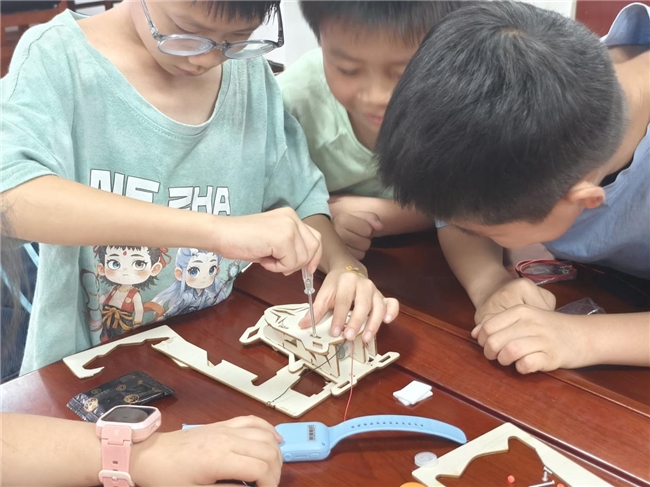 在“小小飞行梦想家”课程中,志愿者们溯源航天历史,以传承红色基因为方向,深入讲解载人航天精神。孩子们亲手制作太阳能直升机,在动手实践中激发对浩瀚蓝天的向往和对建设科技强国的自豪感。